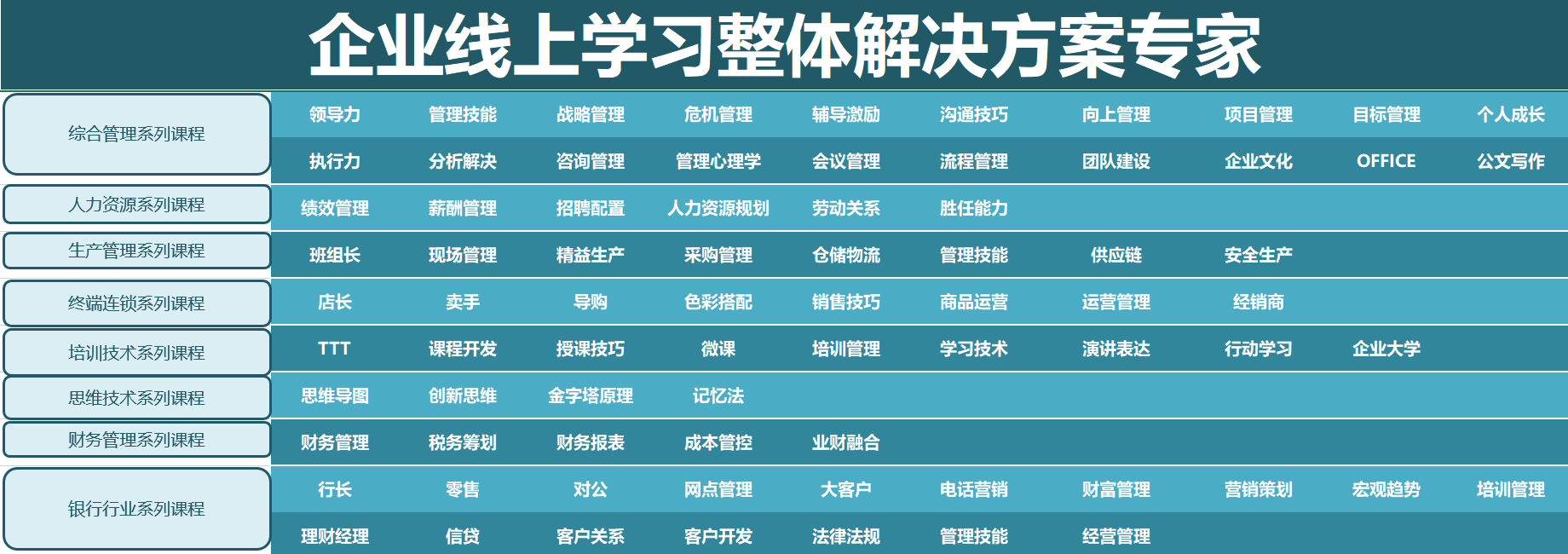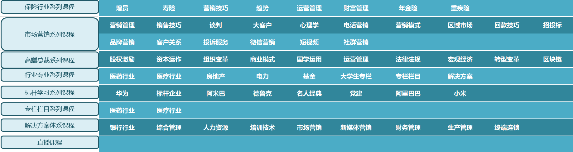 【銀行行業(yè)系列課程】:行長(zhǎng)、零售、對(duì)公、網(wǎng)點(diǎn)管理、大客戶、電話營(yíng)銷、財(cái)富管理、營(yíng)銷策劃、宏觀趨勢(shì)、培訓(xùn)管理、理財(cái)經(jīng)理、信貸、客戶關(guān)系、客戶開發(fā)、法律法規(guī)、管理技能、經(jīng)營(yíng)管理等【保險(xiǎn)行業(yè)系列課程】:增員、壽險(xiǎn)、營(yíng)銷技巧、趨勢(shì)、運(yùn)營(yíng)管理、財(cái)富管理、年金險(xiǎn)、重疾險(xiǎn)等【市場(chǎng)營(yíng)銷系列課程】:營(yíng)銷管理、銷售技巧、談判、大客戶、心理學(xué)、電話營(yíng)銷、營(yíng)銷模式、區(qū)域市場(chǎng)、回款技巧、招投標(biāo)、品牌營(yíng)銷、客戶關(guān)系、投訴服務(wù)、微信營(yíng)銷、短視頻、社群營(yíng)銷等