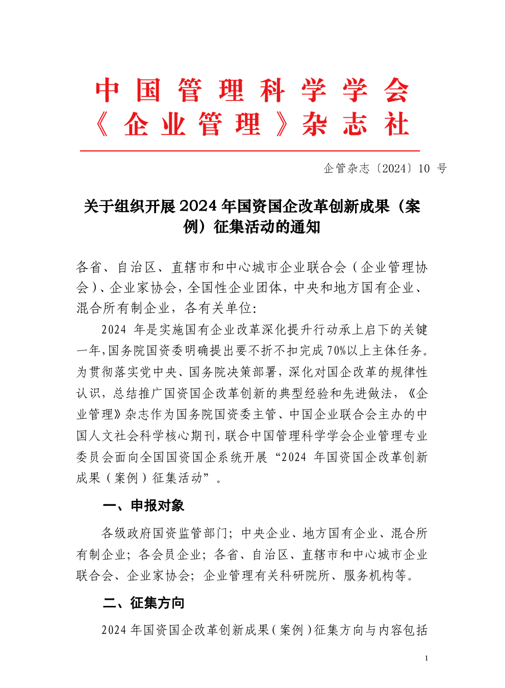 2024年是實(shí)施國(guó)有企業(yè)改革深化提升行動(dòng)承上啟下的關(guān)鍵一年,國(guó)務(wù)院國(guó)資委明確提出要不折不扣完成70%以上主體任務(wù)。為貫徹落實(shí)黨中央、國(guó)務(wù)院決策部署,深化對(duì)國(guó)企改革的規(guī)律性認(rèn)識(shí),總結(jié)推廣國(guó)資國(guó)企改革創(chuàng)新的典型經(jīng)驗(yàn)和先進(jìn)做法,《企業(yè)管理》雜志作為國(guó)務(wù)院國(guó)資委主管、中國(guó)企業(yè)聯(lián)合會(huì)主辦的中國(guó)人文社會(huì)科學(xué)核心期刊,聯(lián)合中國(guó)管理科學(xué)學(xué)會(huì)企業(yè)管理專業(yè)委員會(huì)面向全國(guó)國(guó)資國(guó)企系統(tǒng)開(kāi)展“2024年國(guó)資國(guó)企改革創(chuàng)新成果(案例)征集活動(dòng)”。