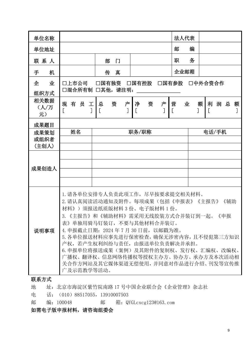 紙質(zhì)材料使用A4紙雙面印刷,裝訂平整。采用普通紙質(zhì)材料作為封面,快遞至:北京市海淀區(qū)紫竹院南路17號(hào)《企業(yè)管理》雜志社。電子版保存為WORD和PDF文檔各一份,發(fā)送至郵箱QYGLcxcg123@163.com 。